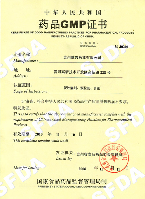 我公司GMP再認證已合格通過,國家食品藥品監督管理局對此發布“藥品GMP認證審查公告”,我公司于2008年11月11日獲換發新的藥品GMP證書,證書包括膠囊劑、顆粒劑、合劑(含中藥提取)生產線,有效期為五年,即至2013年11月10日。